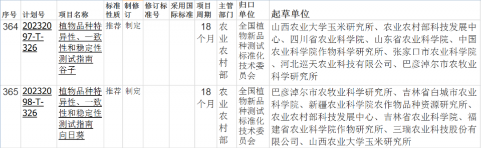 全國植物新品種測試標準化技術委員會歸口管理的《植物品種特異性、一致性和穩定性測試指南 谷子》《植物品種特異性、一致性和穩定性測試指南 向日葵》在本文件中批復立項,研制周期18個月。起草單位集成育種、品種測試、種業推廣等機構,涉及科研、教學、育種企業等主體。充分發揮DUS測試是為種業知識產權保護,品種管理以及為農業“全產業鏈”服務的宗旨,調動優勢力量,在品種選育及測試技術上服務于種業振興及鄉村振興實施。