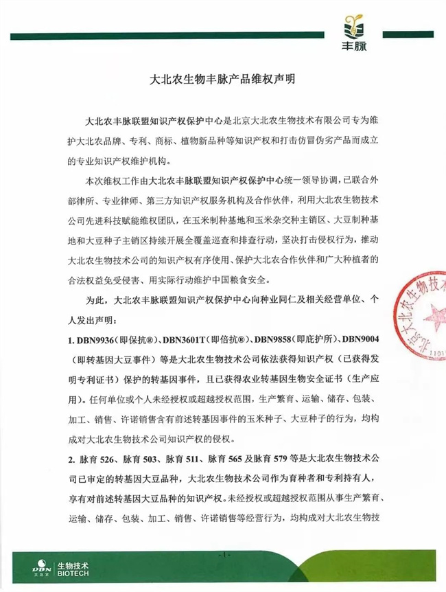 1月3日,大北農生物技術公司(以下簡稱“公司”)發布維權聲明稱,公司的DBN9936(即保抗®)、DBN3601T(即倍抗®)、DBN9858(即庇護所)、DBN9004(即轉基因大豆事件)等是已依法獲得知識產權(已獲得發明專利證書)保護的轉基因事件,且已獲得農業轉基因生物安全證書(生產應用);脈育526、脈育503、脈育511、脈育565及脈育579等是公司已審定的轉基因大豆品種,公司享有對前述轉基因品種的知識產權。若有存在未經授權或超越授權范圍從事生產繁育、運輸、儲存、包裝、加工、銷售、許諾銷售等經營行為,均會對公司權利構成侵犯。