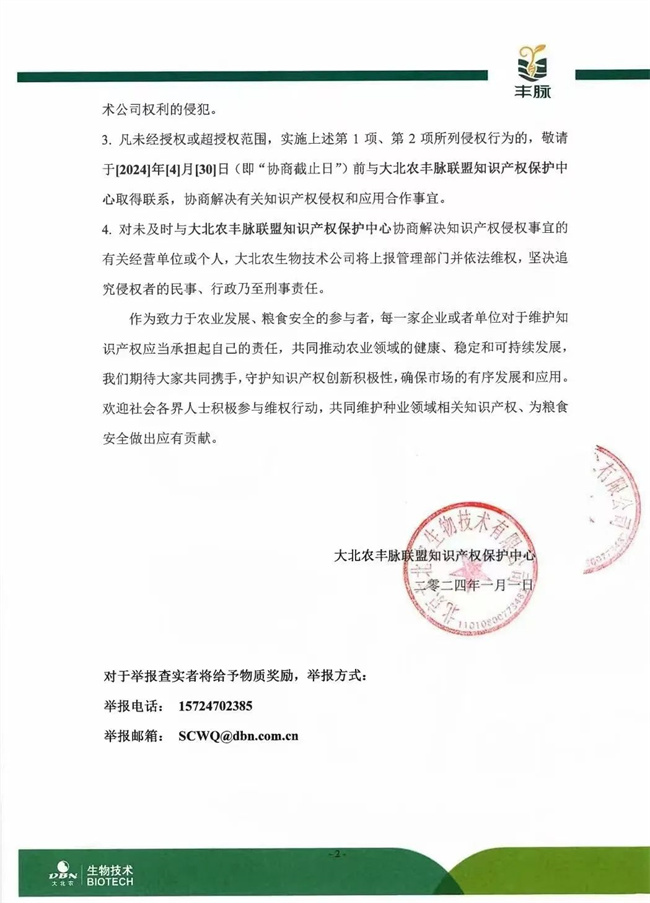 據悉,當前公司已聯合外部律所、專業律師、第三方知識產權服務機構及合作伙伴,在玉米制種基地和玉米雜交種主銷區、大豆制種基地和大豆種子主銷區持續開展全覆蓋巡查和排查行動。希望未經授權或超授權范圍,實施上述侵權行為的主體,于2024年4月30日(即“協商截止日”)前與大北農豐脈聯盟知識產權保護中心取得聯系,協商解決有關知識產權侵權和應用合作事宜。