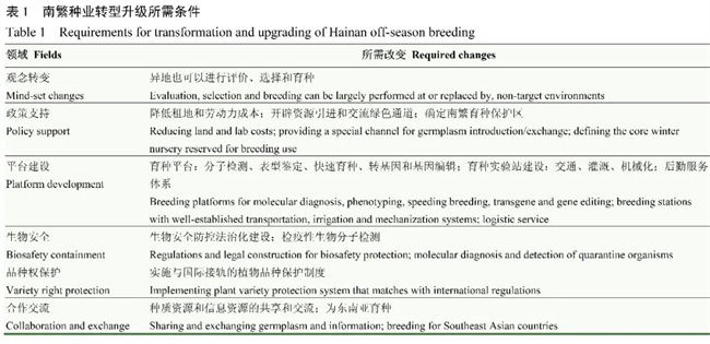 文章(zhang)在分析(xi)了海南(nan)地(di)理生(sheng)態優勢與南(nan)繁種業(ye)(ye)現狀之后(hou),討論了南(nan)繁種業(ye)(ye)的(de)轉(zhuan)型升(sheng)(sheng)級及其(qi)所需條件。實現南(nan)繁種業(ye)(ye)的(de)轉(zhuan)型升(sheng)(sheng)級有賴(lai)于異地(di)選(xuan)擇觀念的(de)轉(zhuan)變(bian)、國家相關政策的(de)支持、分子育種平(ping)臺(tai)的(de)支撐、生(sheng)物(wu)安全(quan)防控(kong)和(he)品種保(bao)護制(zhi)度(du)的(de)建立和(he)完(wan)善、資源共享和(he)交流機制(zhi)的(de)形成(表1)。