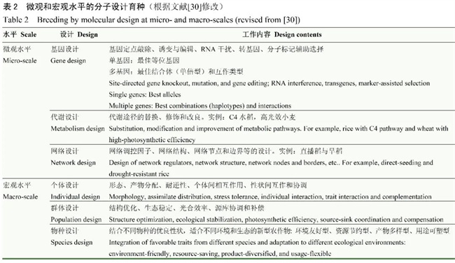 隨后討論了南繁種(zhong)業轉型升(sheng)級之育(yu)種(zhong)理(li)論:數量和(he)群(qun)體(ti)(ti)遺(yi)傳(chuan)、基因型和(he)環境互作、分(fen)子設(she)計(ji)和(he)大數據構(gou)。分(fen)子設(she)計(ji)包括微觀(guan)水平的(de)基因設(she)計(ji)、代謝設(she)計(ji)和(he)網絡設(she)計(ji),宏觀(guan)水平的(de)個體(ti)(ti)設(she)計(ji)、群(qun)體(ti)(ti)設(she)計(ji)和(he)物種(zhong)設(she)計(ji)。論文首次正式提出了有關宏觀(guan)和(he)微觀(guan)層(ceng)次分(fen)子設(she)計(ji)育(yu)種(zhong)的(de)戰略設(she)想(xiang)(表2)。