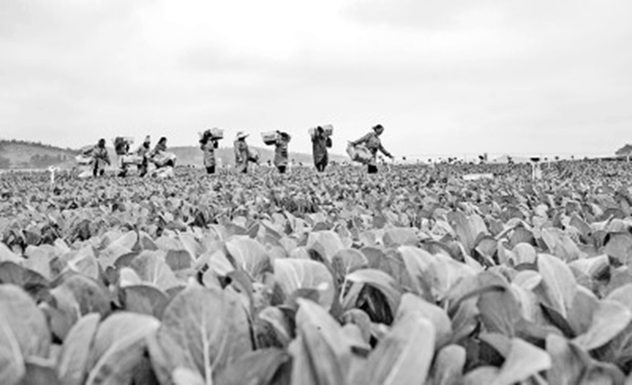 在云南省文山壯族苗族自治州硯山縣,農民在一家蔬菜基地收獲蔬菜。