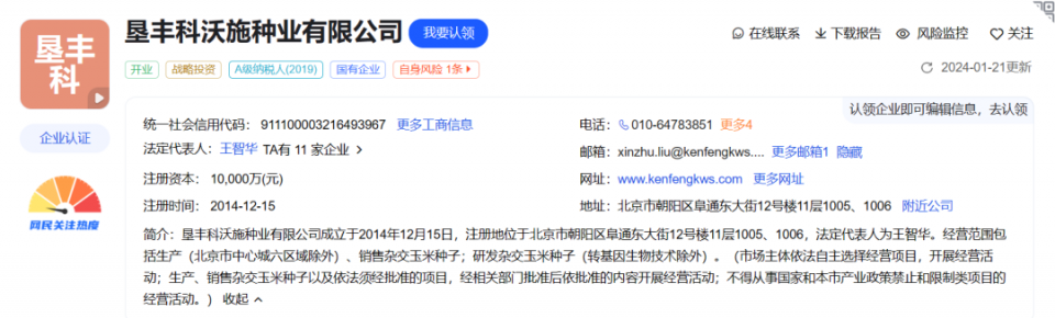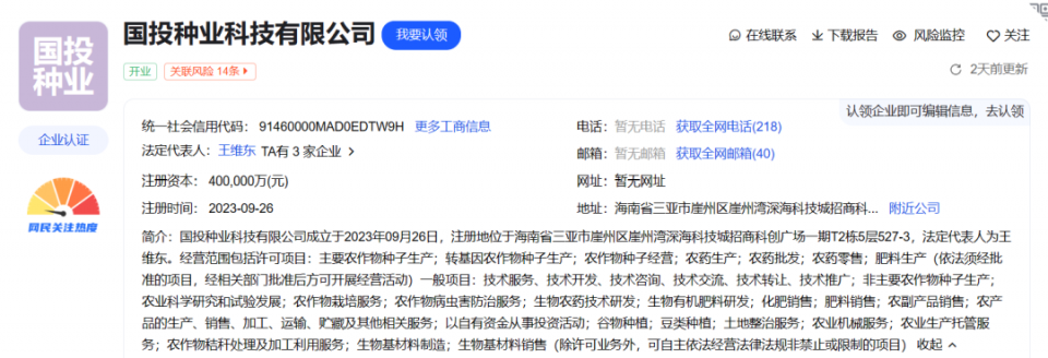 國投種業全稱為國投種業科技有限公司,注冊地位于海南三亞的崖州灣科技城完成,法定代表人王維東,注冊資本40億元,經營范圍包括主要農作物種子生產、轉基因農作物種子生產、農作物種子經營等。公開信息顯示,國投種業為國投集團全資子公司,是國投集團生物育種產業投資運營管理平臺。