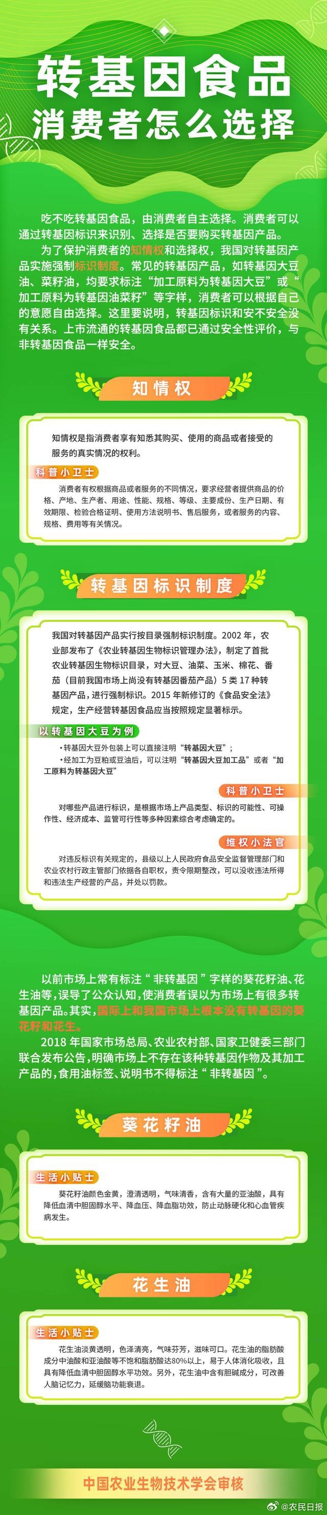 籽” 等字樣,消費者可以根據自己的意愿自由選擇。轉基因標識和安不安全沒有關系。上市流通的轉基因食品都已通過安全性評價。