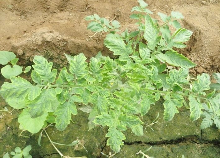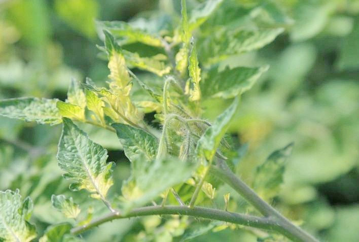 病毒病導致的黃葉往往發生在植株的上部,菜農俗稱“黃頭”,在番茄、辣椒、絲瓜、黃瓜等蔬菜上表現明顯。前期主要表現為生長點附近葉片失綠變黃,之后葉片變平、硬化,扭曲生長,黃化癥狀加重,若不及時加以預防和治療,會導致植株嚴重矮縮,無法正常開花結果。無論是哪種病毒病,剛開始都是零星發生,逐漸發展成片,而生理性缺素造成的黃頭是普遍發生,沒有由點到面的發展過程,菜農要注意區分。