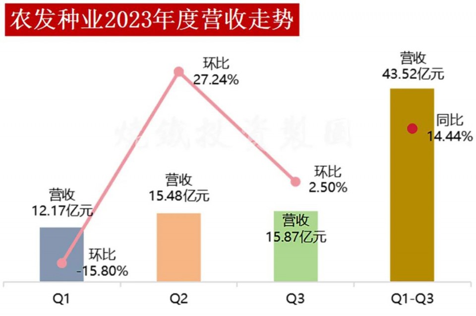 農發種業前三季度總營收43.52億元,同比增長14.44%;Q3營收15.87億元,環比上漲2.5%。