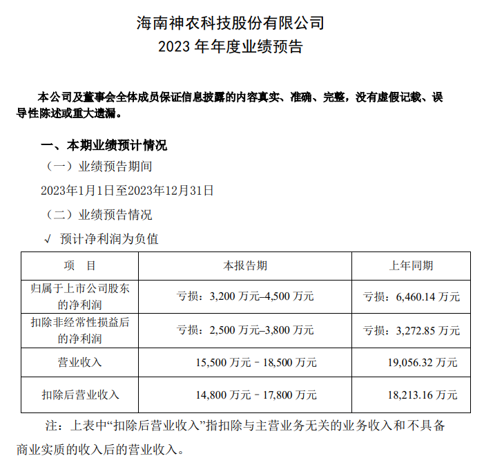 神農科技:預計2023年凈虧損3200萬元–4500萬元