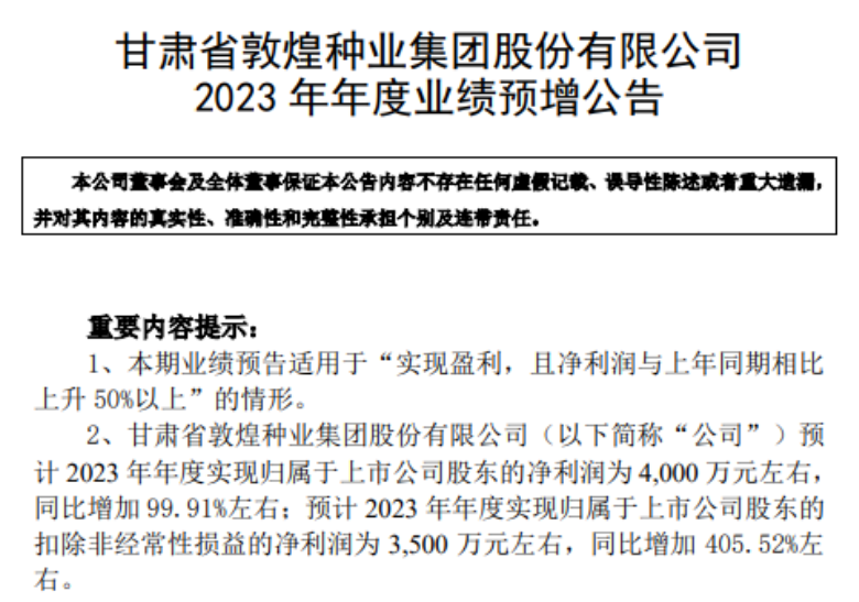 1月30日,甘肅省敦煌種業集團股份有限公司(以下簡稱“敦煌種業”)發布公告稱,公司2023年度預計實現歸屬于上市公司股東的凈利潤為 4,000萬元左右,同比增加99.91%左右;實現歸屬于上市公司股東的扣除非經常性損益的凈利潤為3,500萬元左右,同比增加405.52%左右。