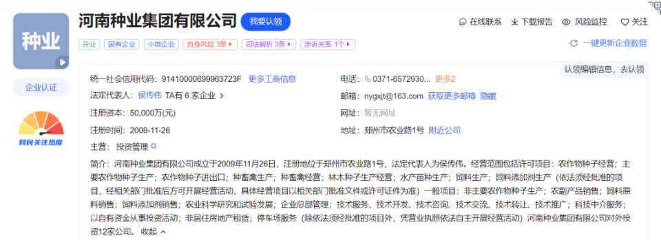 公(gong)(gong)(gong)(gong)開信息顯(xian)示,河(he)南(nan)(nan)(nan)種(zhong)業(ye)(ye)(ye)(ye)集(ji)團法(fa)定代(dai)表(biao)人為侯(hou)傳偉,由河(he)南(nan)(nan)(nan)省(sheng)政府(fu)國資委100%控股(gu)。其控股(gu)或參股(gu)企業(ye)(ye)(ye)(ye)包(bao)括:河(he)南(nan)(nan)(nan)生物育種(zhong)中心有(you)(you)限(xian)公(gong)(gong)(gong)(gong)司(si)(si)(si)(si)(si)、河(he)南(nan)(nan)(nan)農科(ke)(ke)(ke)植保(bao)科(ke)(ke)(ke)技(ji)有(you)(you)限(xian)公(gong)(gong)(gong)(gong)司(si)(si)(si)(si)(si)、河(he)南(nan)(nan)(nan)農科(ke)(ke)(ke)牛(niu)(niu)業(ye)(ye)(ye)(ye)科(ke)(ke)(ke)技(ji)有(you)(you)限(xian)公(gong)(gong)(gong)(gong)司(si)(si)(si)(si)(si)、河(he)南(nan)(nan)(nan)農科(ke)(ke)(ke)園藝科(ke)(ke)(ke)技(ji)有(you)(you)限(xian)公(gong)(gong)(gong)(gong)司(si)(si)(si)(si)(si)、河(he)南(nan)(nan)(nan)農科(ke)(ke)(ke)種(zhong)豬科(ke)(ke)(ke)技(ji)有(you)(you)限(xian)公(gong)(gong)(gong)(gong)司(si)(si)(si)(si)(si)、河(he)南(nan)(nan)(nan)農科(ke)(ke)(ke)置業(ye)(ye)(ye)(ye)有(you)(you)限(xian)公(gong)(gong)(gong)(gong)司(si)(si)(si)(si)(si)、河(he)南(nan)(nan)(nan)農科(ke)(ke)(ke)牧業(ye)(ye)(ye)(ye)有(you)(you)限(xian)公(gong)(gong)(gong)(gong)司(si)(si)(si)(si)(si)、河(he)南(nan)(nan)(nan)和緣食用(yong)菌有(you)(you)限(xian)公(gong)(gong)(gong)(gong)司(si)(si)(si)(si)(si)、河(he)南(nan)(nan)(nan)省(sheng)鼎(ding)元種(zhong)牛(niu)(niu)育種(zhong)有(you)(you)限(xian)公(gong)(gong)(gong)(gong)司(si)(si)(si)(si)(si)、河(he)南(nan)(nan)(nan)秋(qiu)樂種(zhong)業(ye)(ye)(ye)(ye)科(ke)(ke)(ke)技(ji)股(gu)份有(you)(you)限(xian)公(gong)(gong)(gong)(gong)司(si)(si)(si)(si)(si)、河(he)南(nan)(nan)(nan)省(sheng)農業(ye)(ye)(ye)(ye)科(ke)(ke)(ke)學技(ji)術開發有(you)(you)限(xian)公(gong)(gong)(gong)(gong)司(si)(si)(si)(si)(si)等(deng)。
