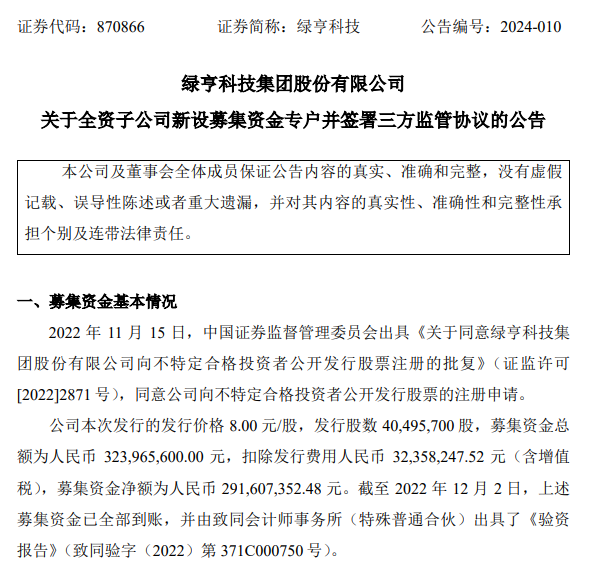 綠亨科技:全資子公司新設募集資金專戶,募資總額3.2億元