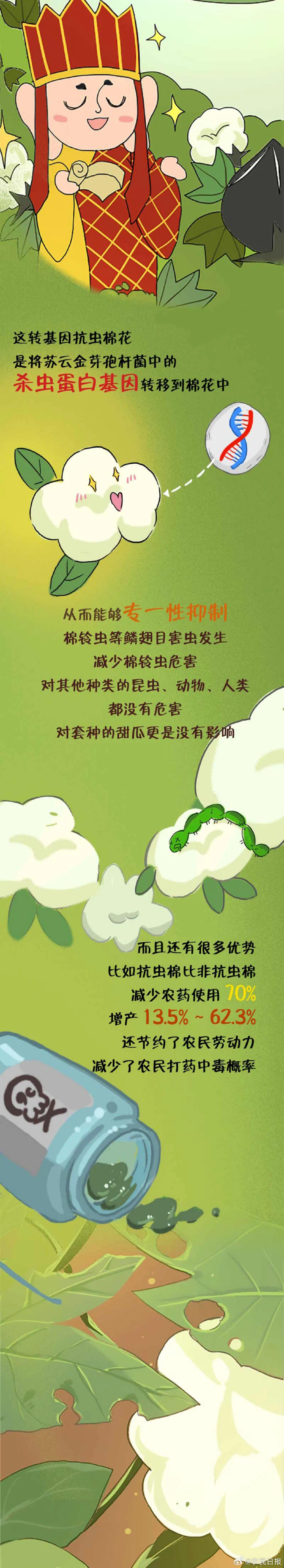 長發育過程中的危害最為嚴重。1992年,我國南北兩大棉區同時爆發棉鈴蟲,產量急劇下降,農藥過量施用導致人畜中毒頻發。為了防治棉鈴蟲,我國從1997年開始商業化種植