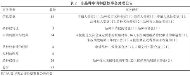在248件大麥品種權保護申請中,有85件非品種申請和授權事務處理公告(表2)。其中,信息變更18件,主要是申請人、品種暫定名稱、培育人和申請人地址變更等。品種權轉讓5件。申請的撤回22件、放棄2件,主要為未按期送交符合規定要求的繁殖材料(16件)和未按期繳納品種權申請的申請費(5件)等。權利的恢復僅6件。品種權申請的駁回8件,原因為申請品種一致性不合格(7件)和申請文件不符合規定(1件)。品種權終止24件,為品種權人未按時繳納年費(22件)和保護期限屆滿而終止(2件)。
