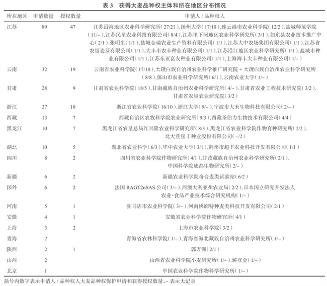 品種權保護是大麥新品種在成果轉化過程中確保育種者權益不受(或少受)侵害的有效措施之一。江蘇沿海地區農業科學研究所、揚州大學等大麥育種單位品種保護意識強,近20年來品種權申請和獲得授權數量居全國前列。國內最早申請大麥新品種權保護的品種蘇啤3號也是江蘇沿海地區農業科學研究所在2003年將大麥列入第五批植物新品種保護名錄后3個月時申請的,并于2005年11月獲得授權,是我國首個獲得授權的大麥品種,實現了我國大麥知識產權保護零的突破。李潔等在2010年對大麥品種權授權情況進行分析,從地區分布看,江蘇省授權品種數量居第1位,其次是云南省;從單位分布看,江蘇沿海地區農業科學研究所、揚州大學、云南省農業科學院品種授權數最多;授權品種中二棱啤酒大麥占主導地位。本文從大麥品種權主體和所在地區分布情況看,與前人分析基本相同,說明2010-2022年期間我國大麥品種權保護僅申請和授權數量有變化,品種權人的分布格局未發生較大改變。