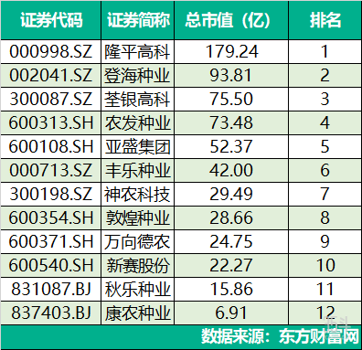 最新市值排名中,隆平高科仍是行業龍頭,總市值179.24億遙遙領先,排名第一。同時,敦煌種業表示未來公司管理層將會重視市值的管理工作,進一步舉措將會具體公告。