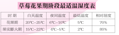 王(wang)培說,草莓(mei)結果(guo)期進行低溫(wen)管理(li),有利于(yu)形成大果(guo)、提(ti)高果(guo)實(shi)硬度(du),因此春季氣溫(wen)回(hui)升后,設施內溫(wen)濕度(du)管理(li)策(ce)略需調(diao)整(zheng)為(wei)降(jiang)溫(wen)增濕。可利用增加(jia)覆(fu)蓋(gai)內膜的層(ceng)數、適當增加(jia)植(zhi)株體(ti)量(liang)、延長(chang)通風時間,讓溫(wen)濕度(du)盡量(liang)保(bao)持在適宜區(qu)間(見下(xia)表)。