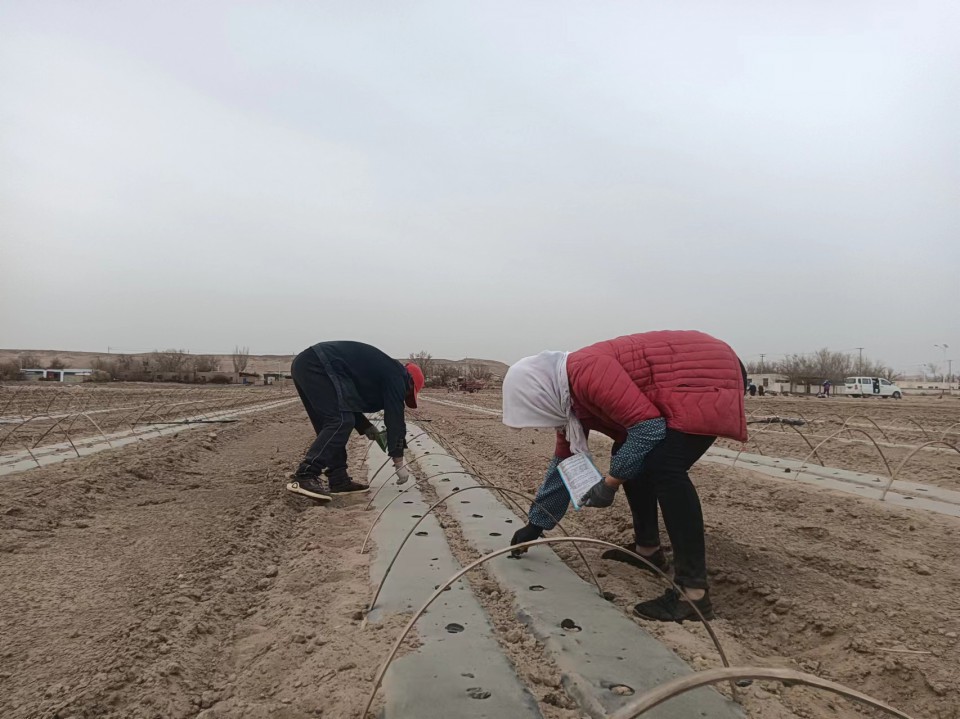 3月15日,新疆哈密市伊州區南湖鄉紅山村的瓜農們正在進行哈密瓜點種。通過機械打好的農膜點種孔,農民把種子手工投入苗穴,并封好土,確保種子吸收養分。南湖鄉哈密瓜種植都采用了“干播濕出”技術。點籽封土后,架上小拱棚,再通過滴灌帶澆水后,就可以靜等出苗了。
