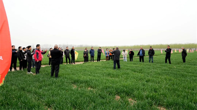 觀摩會上,與會嘉賓實地查看豐麥寶渦麥33小麥長勢及表現,聽取了技術老師就如何通過栽培技術,發揮渦麥33品種優勢,挖掘品種高產潛力的介紹。