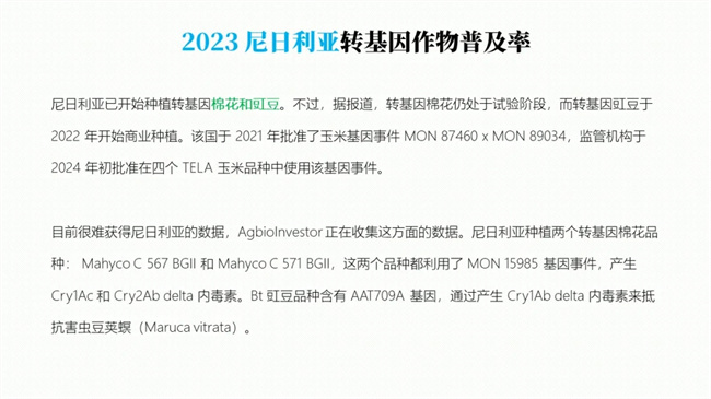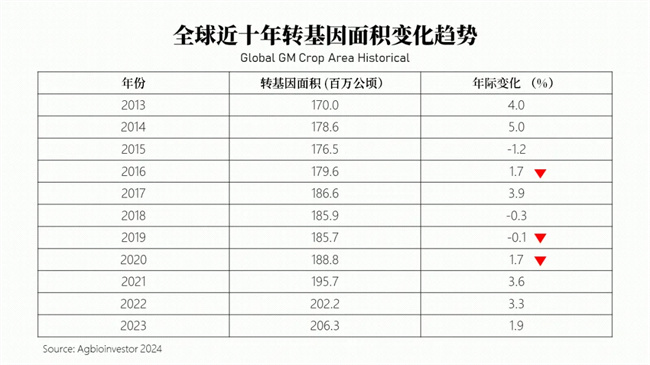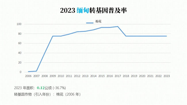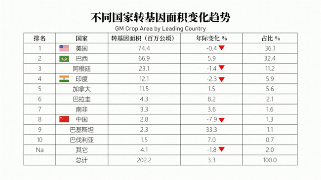 除種植面積不足 10 萬公頃的國家外,面積變化最大的國家是巴基斯坦(+33.3%)、越南(+22.2%)、巴拉圭(+8.2%)和玻利維亞(+7.0%),其原因是總種植面積增加和普及率的提高。轉基因面積降幅最大的國家是緬甸(-36.7%)、中國(-7.9%)、菲律賓(-3.4%)、澳大利亞(-3.1%)和印度(-2.3%)。
