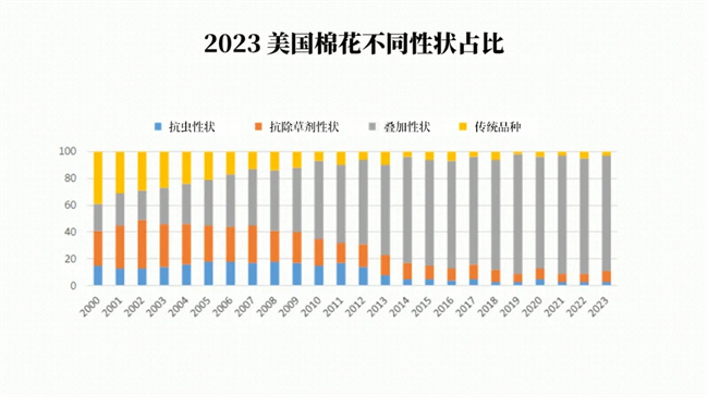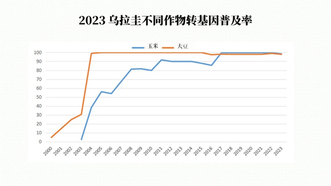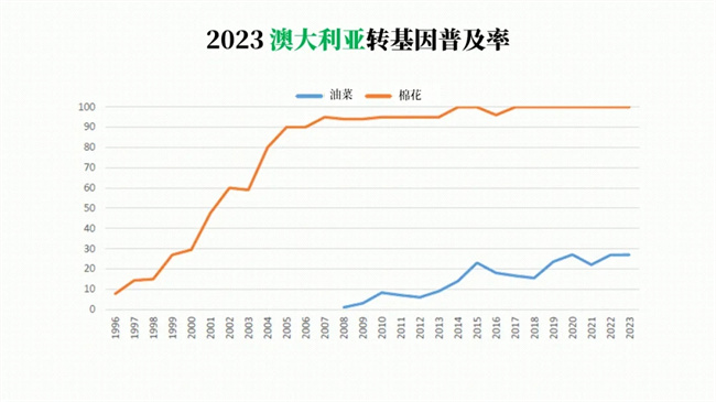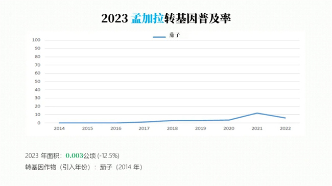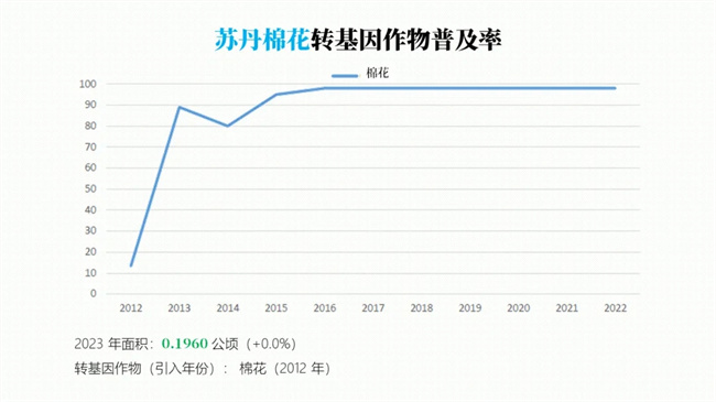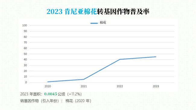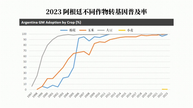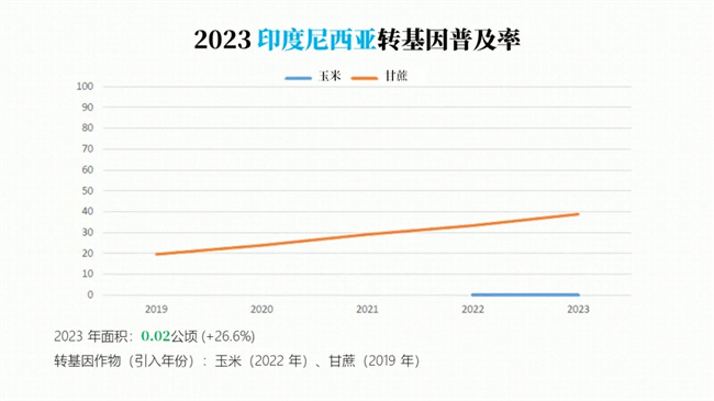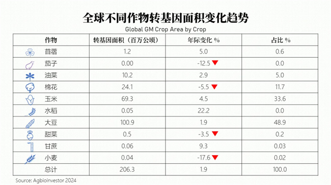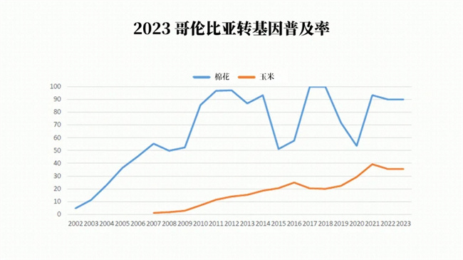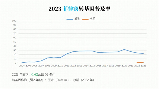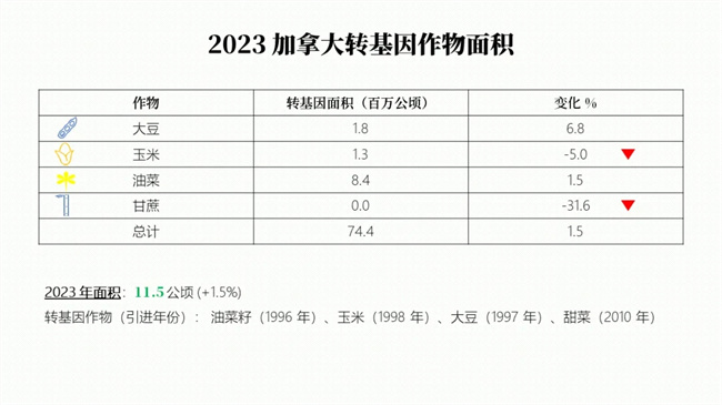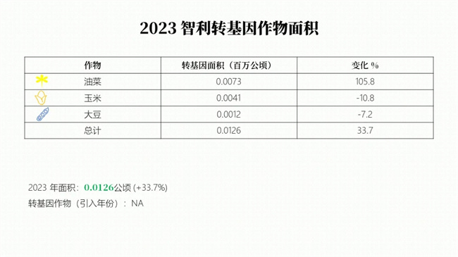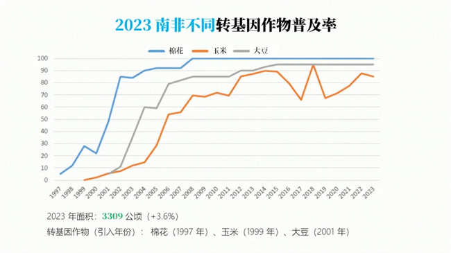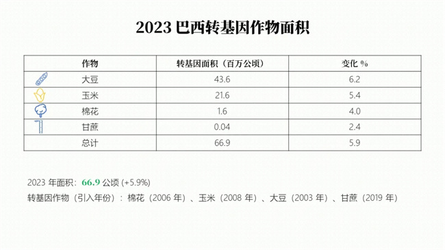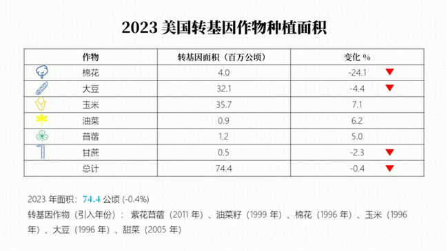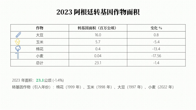 2023 年,全球轉基因作物種植面積比上一年增加了 1.9%,達到 2.063 億公頃,創下新紀錄。27 個國家種植了 11 種不同的轉基因作物,其中大豆種植面積最大,達到 1.009 億公頃,這是該作物種植面積首次超過 1 億公頃。緊隨大豆之后的是玉米(6930 萬公頃)和棉花(2410 萬公頃)。