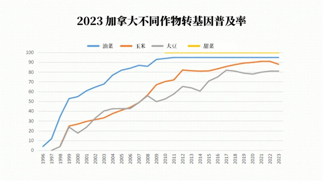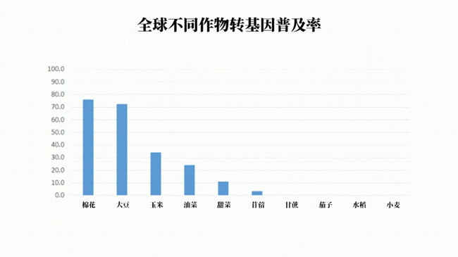 下表和柱狀圖顯示了每種作物的全球采用率。棉花的轉基因普及率最高,占全球棉花總面積的 76.0%,其次是大豆(72.4%)、玉米(34.0%)和油菜籽(24.0%)。隨后,全球普及率迅速下降。