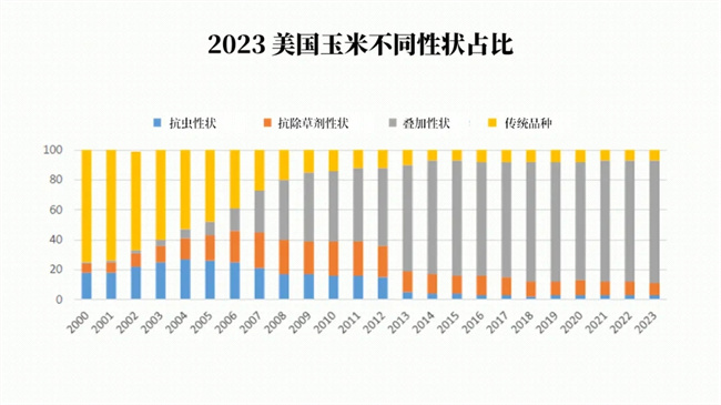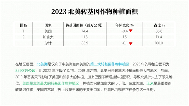 在地區層面,北美洲是僅次于中南美洲的第二大轉基因作物種植區,2023 年的種植總面積為 8590 萬公頃,比 2022 年下降了 0.1%。2019 年之前,北美洲是轉基因種植面積最大的地區,然而,2019 年惡劣天氣影響了美國和加拿大的種植,加上巴西不斷增加種植面積,導致北美洲失去了領先地位。美國是北美最大的轉基因作物種植區,種植面積是加拿大的 6.5 倍。在北美洲,玉米是最重要的轉基因作物,美國通常是世界上收獲玉米的主要出口國,盡管巴西現在正在爭奪這一頭銜。