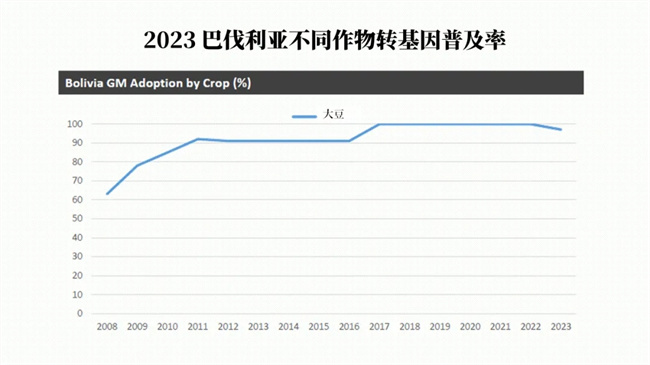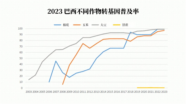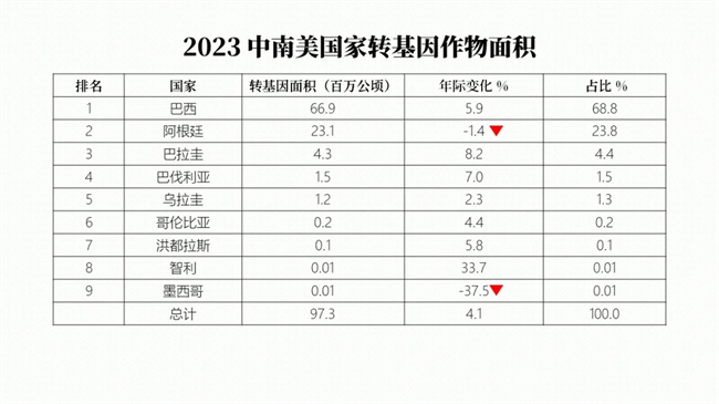 在地區層面,2023 年(2022/23 農業年)中南美洲的轉基因作物面積最大,達 9730 萬公頃。種植面積比上一年增加了 4.1%,其中巴西的種植面積增加了 5.9%;按數量計算,增加了 370 萬公頃。2019年,中南美洲超過北美洲,成為轉基因作物種植面積最大的地區,這部分歸功于巴西轉基因作物面積的發展。巴西的轉基因作物面積迅速擴大,目前已占該地區轉基因作物面積的近 69%。繼巴西之后,阿根廷成為該地區第二個領先國家,其轉基因作物種植面積占 23.8%。巴西和阿根廷之后,其余國家的轉基因作物面積迅速減少,排名第三的巴拉圭僅占該地區轉基因作物面積的 4.4%。在中美洲和南美洲,大豆是最主要的作物,占該地區轉基因作物面積的 67.6%。