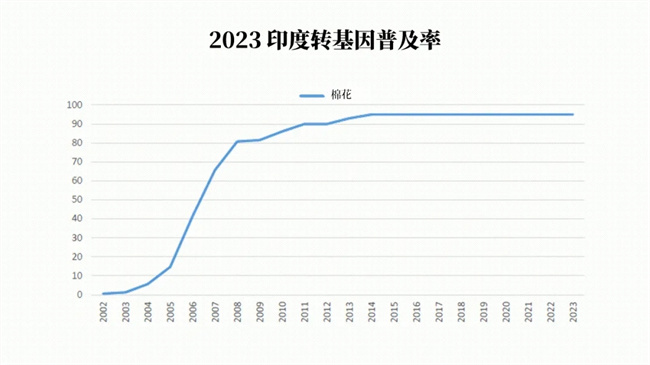 亞太地區的轉基因作物總面積明顯小于美洲地區,2023 年為 1 950 萬公頃。目前,印度占該地區轉基因種植面積的絕大部分(61.9%)。在作物方面,棉花是最主要的轉基因作物,占該地區轉基因作物總面積的 90.8%以上。