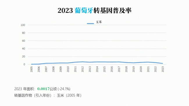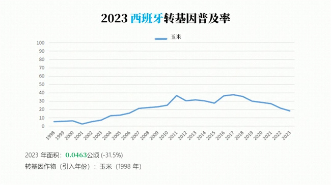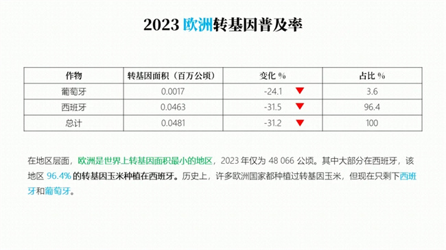 在地區層面,歐洲是世界上轉基因種植面積最小的地區,2023 年僅為 48 066 公頃。其中大部分在西班牙,該地區 96.4% 的轉基因玉米種植在西班牙。歷史上,許多歐洲國家都種植過轉基因玉米,但現在只剩下西班牙和葡萄牙。