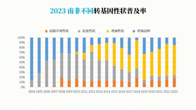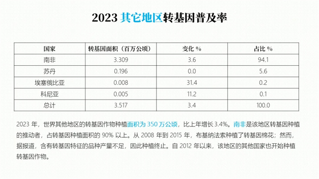 2023 年,世界其他地區的轉基因作物種植面積為 350 萬公頃,比上年增長 3.4%。南非是該地區轉基因種植的推動者,其種植面積占轉基因種植面積的90%以上。從 2008 年到 2015 年,布基納法索種植了轉基因棉花;然而,據報道,含有轉基因特征的品種產量不足,因此種植終止。自 2012 年以來,該地區的其他國家也開始種植轉基因作物。