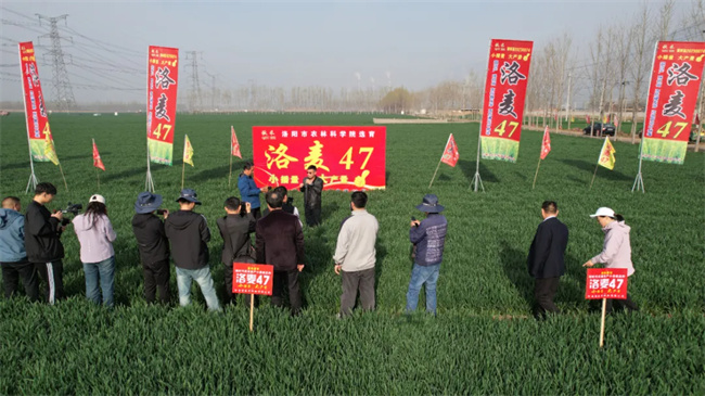 會議前,各位與會嘉賓參加了“小播量,大產量”的洛麥47苗期觀摩品鑒,見證了“洛麥47”分蘗強、葉色濃綠、根系發達良好長勢,并在田間分享了“洛麥47”推廣應用經驗和心得體會,表達了對洛麥47高產、穩產、優質、廣適綜合優勢表現的高度認可。
