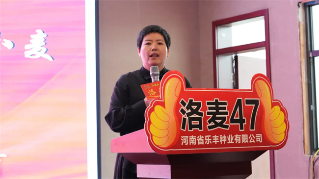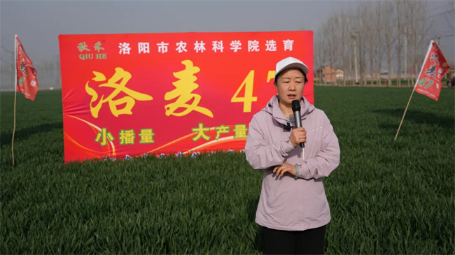 田間,焦作市種業發展中心焦竹青主任對焦作種業發展和品種應用推廣情況作詳細介紹,給洛麥47予高度評價,對樂豐種業大力推廣洛麥47這一優良品種表示贊賞。她表示,自己一直很關注洛麥47,在多年多點大田種植和示范推廣中,洛麥47抗倒性強、抗凍性好、豐產性好等優良性狀充分展現,是一個具有廣闊推廣應用前景的好品種。希望各位經銷商朋友和種植戶放心推廣、大膽種植,為農民的增產增收做出積極貢獻!