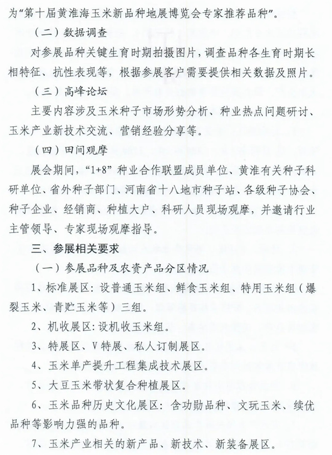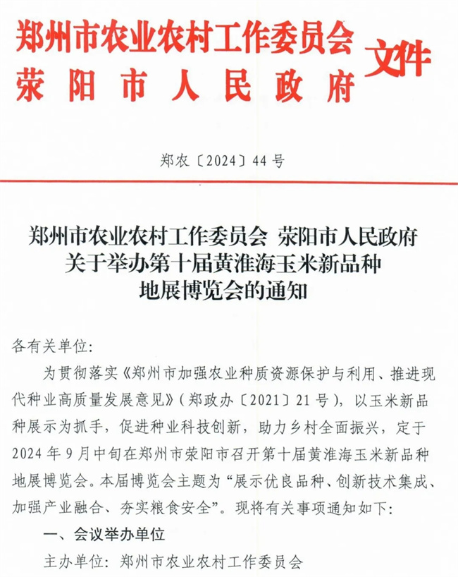 為貫徹落實《鄭州市加強農業種質資源保護與利用、推進現代種業高質量發展意見》(鄭政辦〔2021〕21號),以玉米新品種展示為抓手,促進種業科技創新,助力鄉村全面振興,定于2024年9月中旬在鄭州市滎陽市召開第十屆黃淮海玉米新品種地展博覽會。本屆博覽會主題為“展示優良品種、創新技術集成、加強產業融合、夯實糧食安全”。現將有關事項通知如下: