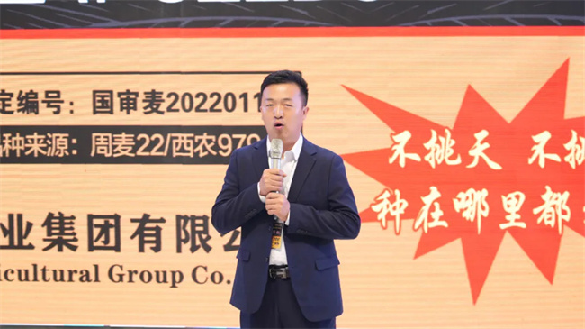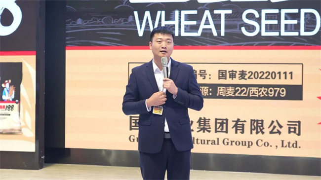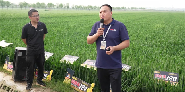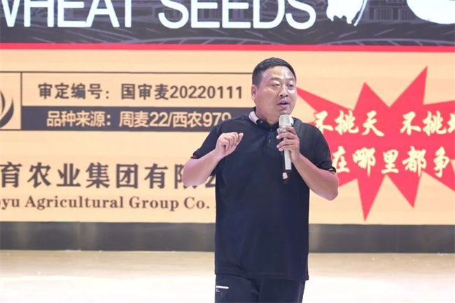 國鑫麥188南陽市總經銷李運軍李總做典型交流發言。李總表示,“國鑫麥188”具有六大突出特征:株高低、品質優、綜合抗病強、產量高,在抗凍和抗黃花葉病毒病等方面有著良好表現。正是國鑫麥188這么多的亮點,越來越受到市場歡迎,零售商和種地大戶認可,市場份額不斷擴大,自己大力推廣的信心也更加堅定,期望繼續緊跟國育農業集團發展步伐,在2024年再創佳績。