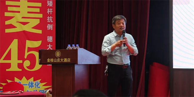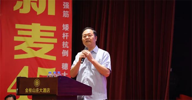 依托優良品種和公司技術優勢,促進種業高質量發展。會上,谷神種業董事長王軍就如何充分發揮高產強筋小麥谷神麥19和新麥45品種優勢,因地制宜,配套相應的高產栽培技術,以期實現綠色、高質、高效,促進產業高質量發展做賦能分享。