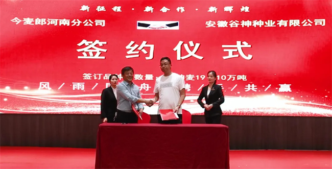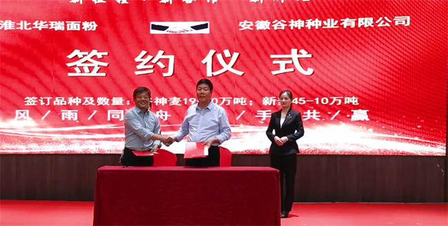 會上,谷神種業分別與今麥郎河南分公司和淮北華瑞面粉有限公司簽訂了戰略合作協議,合力助推優質小麥產業高質量發展。