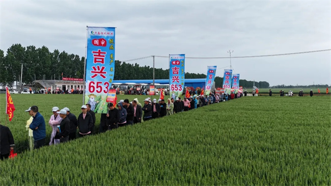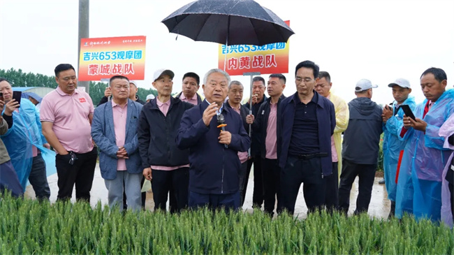 吉興653田間觀摩現場,河南農業大學國家小麥工程技術研究中心教授、博士生導師、農業農村部小麥專家指導組顧問郭天財教授高度稱贊吉興653既成穗高又穗子大,抗性又好,我3年來關注該品種均表現不錯,是一個穩產高產的好品種,對這樣的品種希望廣大經銷商要大力推廣,盡快上量上面積,讓農民朋友用上好種子多打糧。同時,當前,小麥已進入灌漿期,是最終經濟產量的形成期,也是預防旱、澇、風、病蟲、倒伏等自然災害的關鍵時期。希望大家做好小麥中后期管理,爭取糧食增產增收再上一個新臺階;懷川種業副總經理梁紅衛重點介紹小麥原種生產流程和確保高質量種子的關鍵措施,不光生產的品種好,還得質量好,讓大家銷售放心,售后安心。