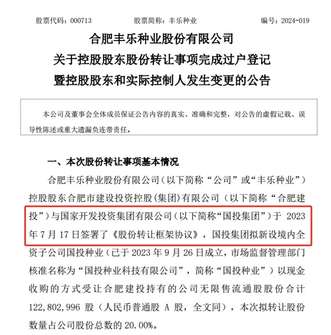 以民生健康業務為例,豐樂種業4月30日發布《關于控股股東股份轉讓事項完成過戶登記暨控股股東和實際控制人發生變更的公告》,標志著國投種業正式控股豐樂種業,國投又控股了1家A股公司。