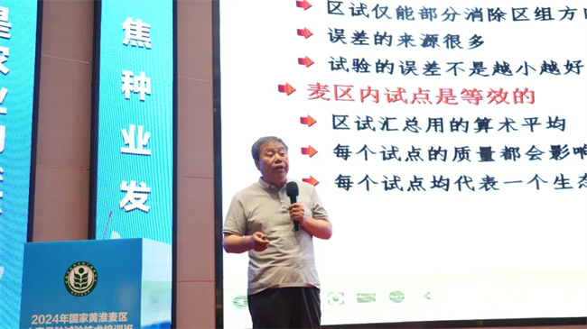 下午室內環節的小麥品種試驗技術培訓班上,農業農村部農村經濟研究中心研究員姜楠、全國農技中心首席專家王玉璽、河南省農業科學院研究員王西成分別就《我國小麥產業發展現狀與政策走向》、《品種審定的形勢與品種創新管理》、《區試田間技術管理》做精彩授課講座。