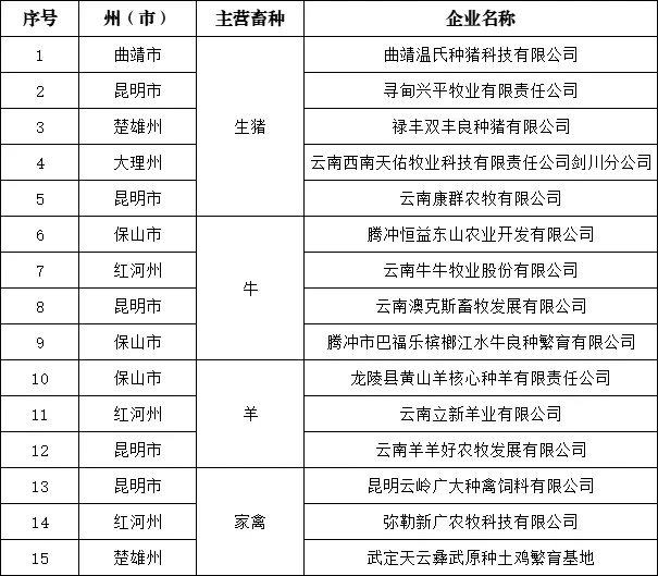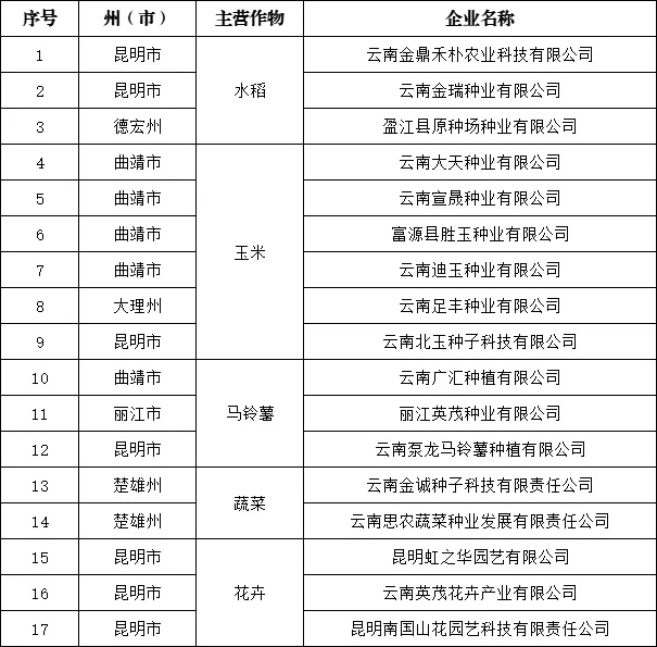 根據企業資產實力、育種研發、創新成果、市場規模等情況,決定遴選云南金鼎禾樸農業科技有限公司等17家企業為省級農作物種業陣型企業;曲靖溫氏種豬科技有限公司等15家企業為省級畜禽種業陣型企業;西雙版納云博水產養殖開發有限公司等10家企業為省級水產種業陣型企業。