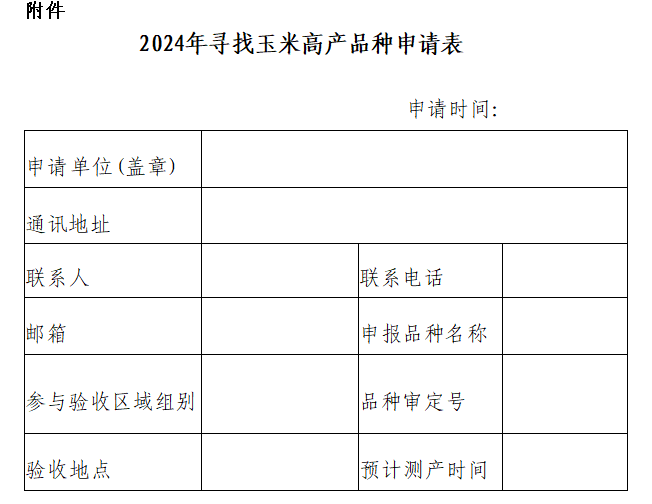 (一)申報單位填寫《2024年尋找玉米高產品種申請表》,東華北春播區和西北區于6月20日前、黃淮海夏播區于6月30日前將申請表的電子版文件、蓋章后掃描文件一并發至郵箱:jiaweiqiang1016@163.com。
