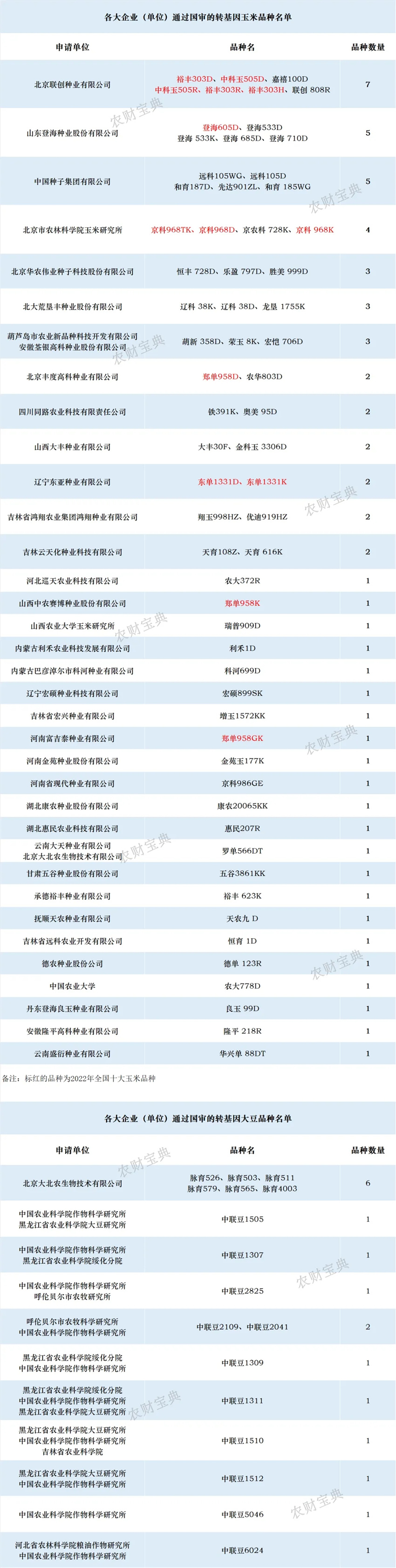 在(zai)2022年全國(guo)推廣面積(ji)前10大(da)玉(yu)米品種(zhong)中(zhong),裕豐303、鄭單(dan)958、中(zhong)科玉(yu)505、京科968、登(deng)海605、東單(dan)1331等6個已成功升級(ji)為(wei)轉基(ji)因品種(zhong)。