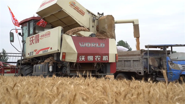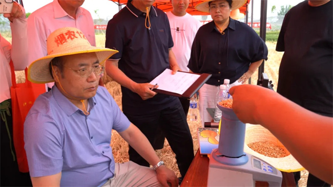 “根據農業農村部全國糧食高產創建文件驗收辦法的有關規定,專家組實地查看了小麥的田間長勢,在聽取有關情況介紹的基礎上,經過面積丈量,采取聯合收割機連片實打實收,收割前進行全面清倉檢查,田間落粒不計入產量,稱重取樣測定水分雜質粒率去除等環節,驗收結果如下:整塊地長勢良好,地塊長150米,寬17.675米,面積3.98畝,共收獲鮮籽粒3848公斤,經過水分測定儀5點取樣,平均含水率21.08%,雜質率1%,按照入庫13%的標準含水量,折合畝產868公斤。”專家組現場公布實打測產結果。