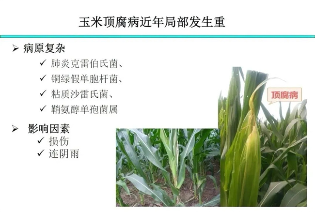在玉米頂腐病發病初期(qi)及(ji)時進行藥(yao)(yao)劑防治,可選用(yong)80%代森錳(meng)鋅600倍液或選用(yong)10%苯醚甲環唑800倍液施藥(yao)(yao),用(yong)藥(yao)(yao)2次,間隔10-15天。