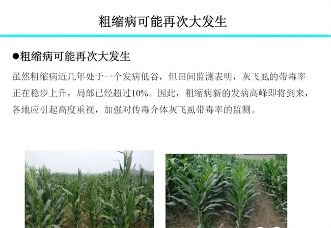 粗縮(suo)病多(duo)在玉米(mi)5-6葉時出(chu)現(xian),病苗濃綠,節間縮(suo)短,葉片僵直(zhi),寬(kuan)短而(er)厚(hou),植株(zhu)生長緩慢、矮(ai)化。