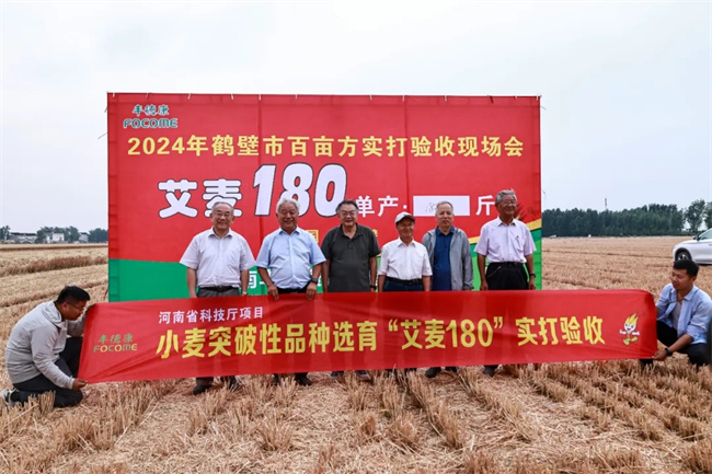 2024年6月6日,由農業農村部小麥專家指導組、河南省農業技術推廣總站和鶴壁市農業農村局等單位組成的專家組,對河南省鶴壁市城鄉一體化示范區王寨村的百畝方種植的艾麥180優質小麥新品種進行實打驗收,單產912.6公斤/畝,創下今年以來全國小麥高產新紀錄!