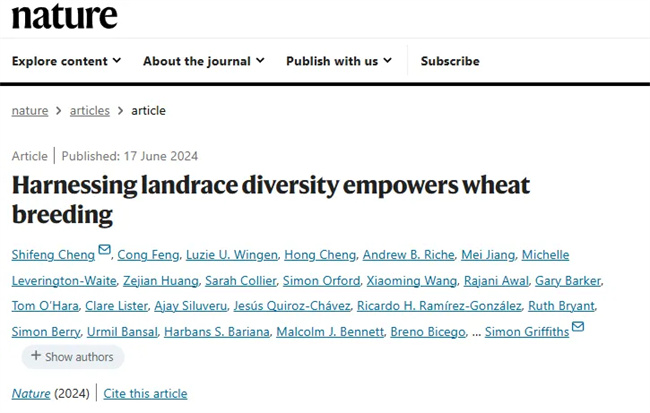 北京時間2024年6月17日23時,國際頂尖期刊《自然(Nature)》刊登了中國農業科學院深圳農業基因組研究所(嶺南現代農業科學與技術廣東省實驗室深圳分中心)聯合英國約翰·英納斯中心(John Innes Centre)等國內外多家優勢單位完成的最新研究成果,題為“Harnessing Landrace Diversity Empowers Wheat Breeding(利用地方品種多樣性助力現代小麥育種)”。