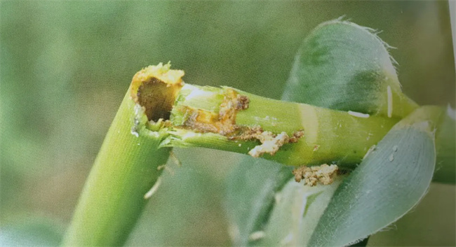 幼蟲孵化后,一部分潛藏在雌穗著生節以上各葉片的葉腋間,取食積存的花粉和葉腋組織,至4齡后蛀莖為害;絕大部分初孵幼蟲集中到雌穗頂端的花絲基部取食為害。生活在雌穗頂端的幼蟲取食花絲及未成熟的嫩粒,使籽粒殘缺不全,并引起霉爛,降低玉米籽粒的品質。至4~5齡時,這些幼蟲有的自雌穗頂端蛀軸,有的自雌穗基部蛀入雌穗柄,也有的蛀入雌穗著生節上下莖稈。但此時玉米已進入灌漿中、后期,雌穗的大小已經定型,這一代幼蟲主要影響千粒重和籽粒的品質。