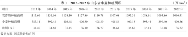 山東地處黃河中下游,位于34°23′~38°23′N,氣候資源和土壤資源豐富,非常適宜小麥生長,小麥種植面積全國第二,約占全國的14%。多年來山東小麥單產位居全國前列,數次打破全國冬小麥高產紀錄,山東省小麥生產的波動直接影響著全國的小麥供應。近年來,山東省各級政府積極落實惠農、補貼政策,推動撂荒農田復耕復種,加上農村土地流轉機制不斷健全完善,種糧大戶數量迅速增加,農民種糧積極性不斷提高,小麥種植面積也不斷增加。據統計,全省小麥種植面積由2013年的383.14萬hm²增至2022年的400.36萬hm²,增加17.22萬hm²,增幅4.49%,其中2013-2015年增加迅速,2015年以后山東省小麥種植面積趨于穩定,常年在400萬hm²左右(表1)。2022年山東省冬小麥種植面積400.36萬hm²,商品種子使用量6.8億kg,全省小麥種子市場規模達到30.63億元,居全國第1位。