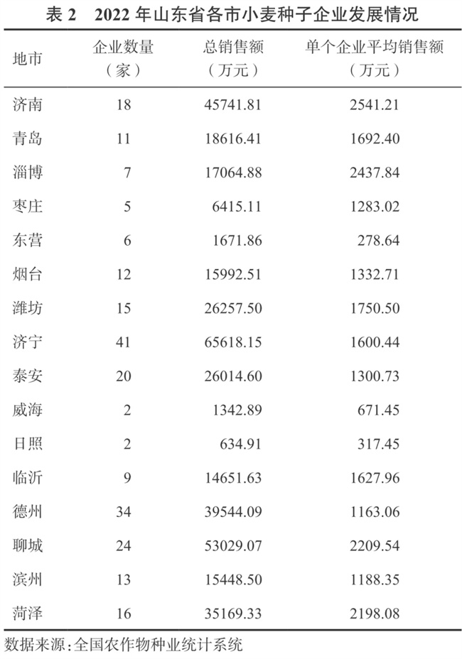 從區域分布看,企業主要集中在濟寧、德州、聊城等市,分別為41家、34家、24家(表2)。一方面,這3個市小麥種植面積廣闊,種子需求量大,種子企業發展基礎好,培育出了本地的規模種子企業;另一方面,它們均建有多個國家級和省級小麥良種繁育基地,優質基地吸引重點種子企業繁種、建廠,逐漸形成種子產業集群。威海、日照等市耕地面積相對少、市場小,企業數量較少。從銷售情況看,濟寧、聊城、濟南總銷售額較大,分別約為6.56億元、5.30億元、4.57億元,濟南、淄博、聊城單個企業平均銷售額較高,分別為2541.21萬元,2437.84萬元、2209.54萬元(表2)。