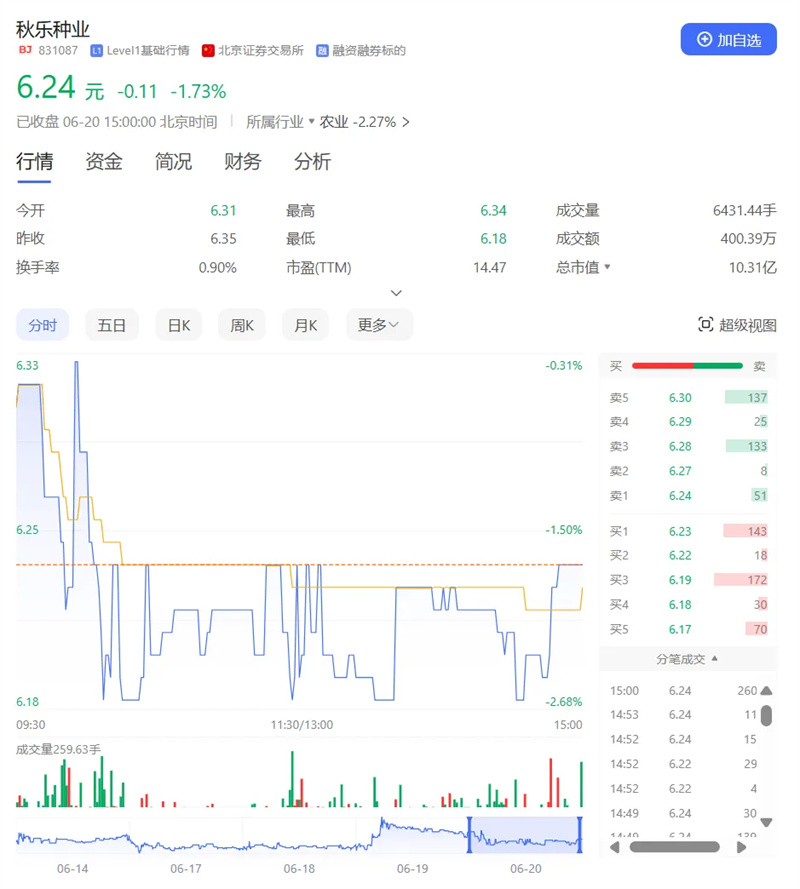 6、荃銀高科[300087]安徽荃銀高科種業股份有限公司2010年5月在深圳證券交易所上市,目前市值62.14億元。公司“以種業為核心,農業服務為延伸,探索和創新農業多元化發展”,雜交水稻研發、推廣及海外業務規模均位居全國種子企業前2位。